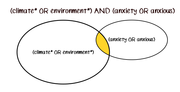 For example, if you are searching for scientific articles about climate and anxiety, you can use AND to ensure that the articles you find mention both climate and anxiety.